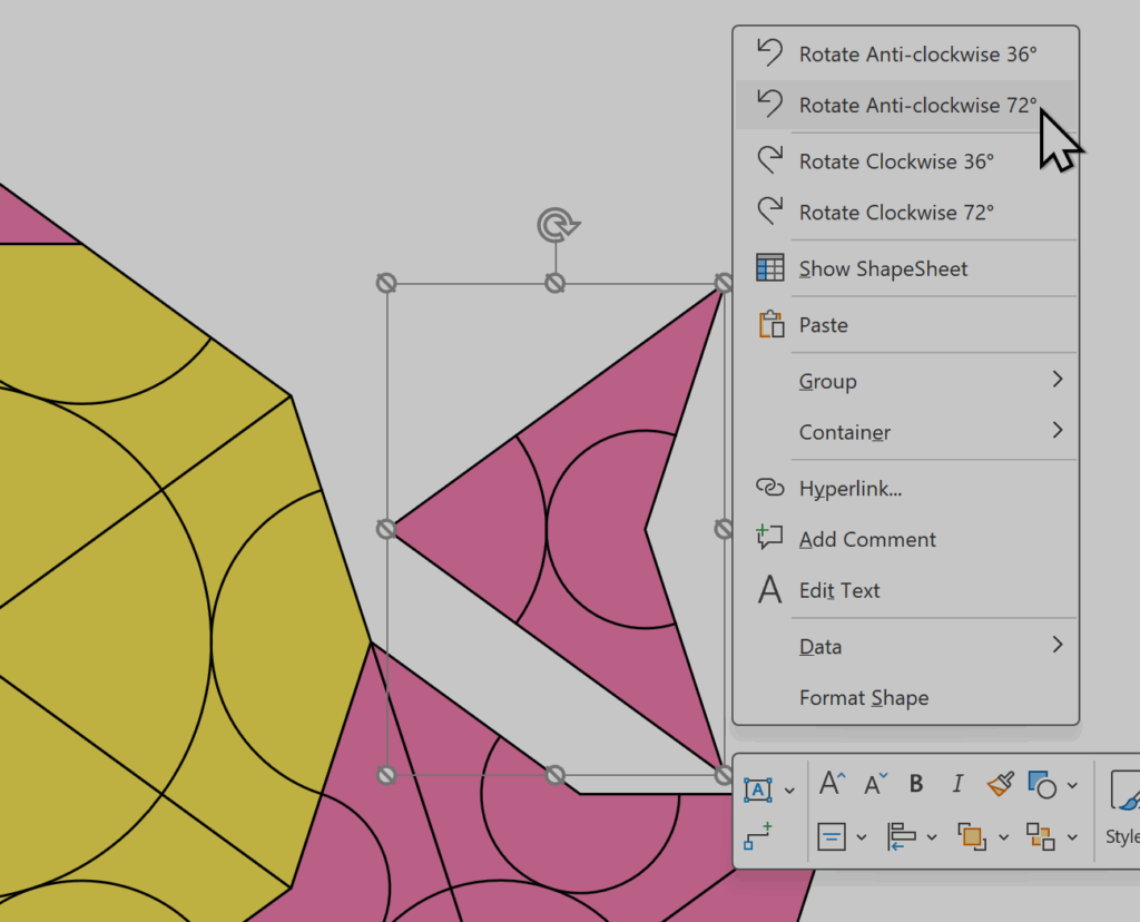 I have added 4 right mouse menu actions to each shape to assist in rotating shapes clockwise and anticlockwise by 36 and 72 degrees. The normal Visio rotation handle can be used too, but I used them to only rotate to 0, 90, 180, 270 and then used the extra 32 or 72 degree rotation actions afterwards.